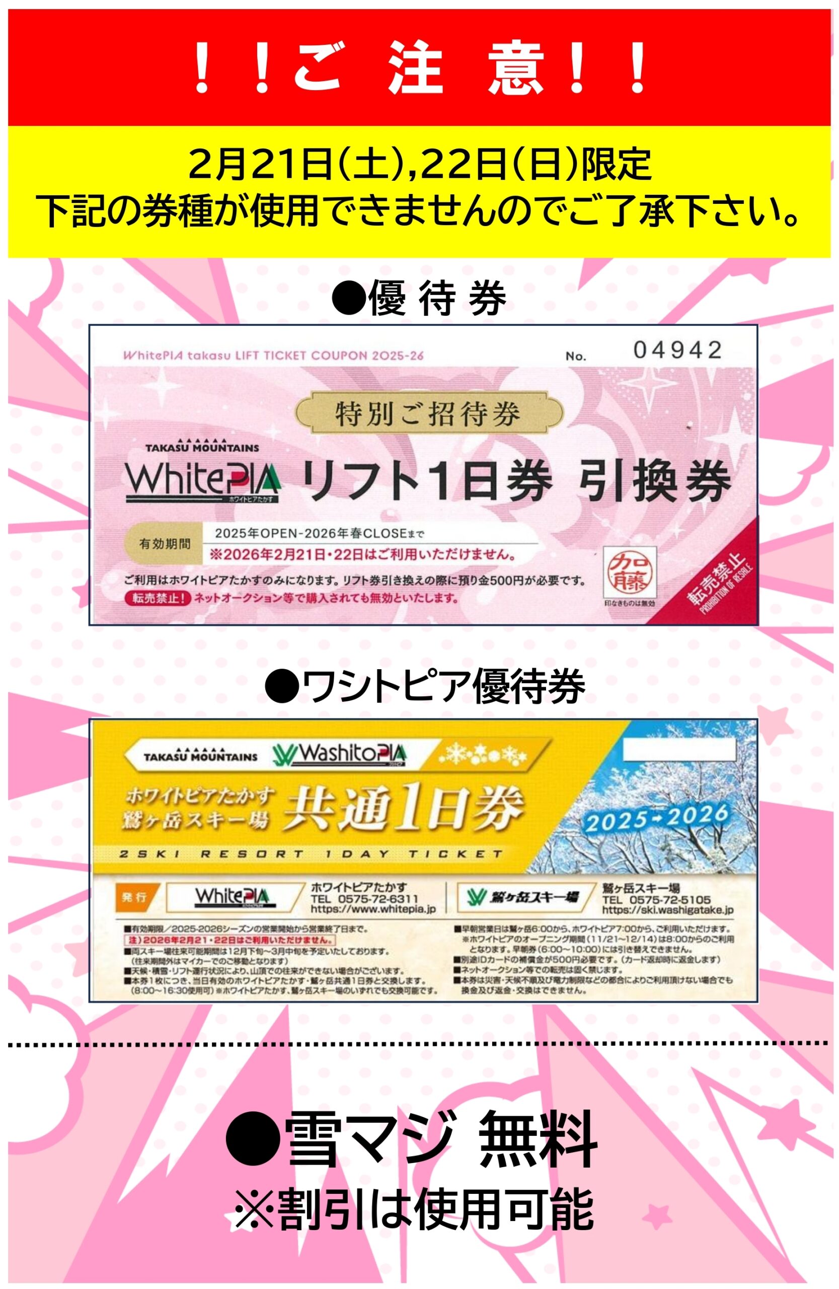 今週末の3連休の21日と22日は、上記の券種がご利用ができませんのでご了承下さいませ。